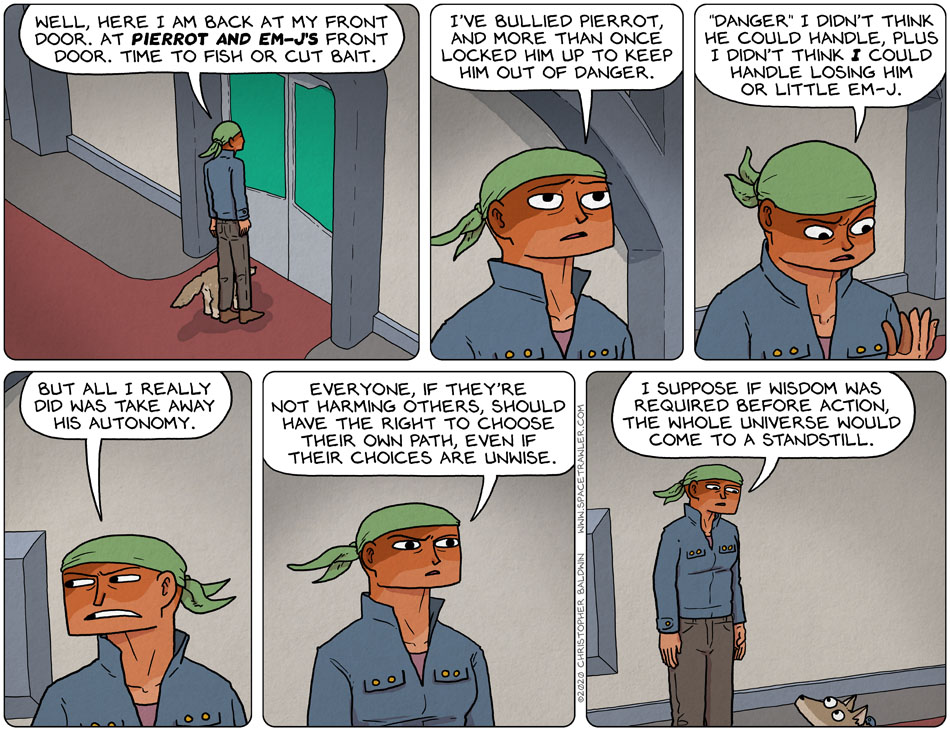 Nice to see her seriously thinking about things she has or hasn’t done in the past and if they were bad ideas or wrong ones despite the positive outcomes. I like that, a thoughtful character. A habit I would recommend for everyone to do periodically, self introspection to see if you need to change somethings about yourself. Even to questioning things you don’t question.