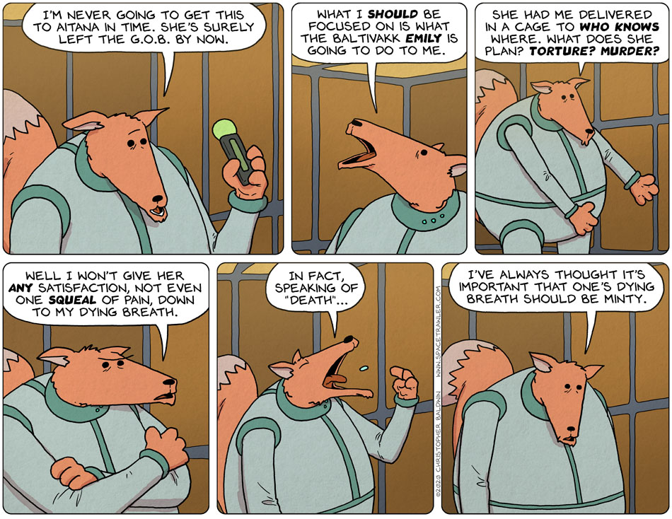 I just hope Emily hasn’t forgotten about her. I mean, she’s in that box, which presumably has some sort of Maxwell’s Demon to ensure a fresh supply of oxygen, but there’s no waste disposal units, nor water for washing after or for drinking.