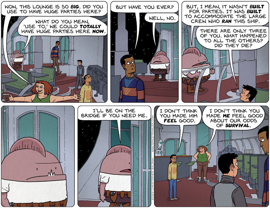 Next strip (a few seconds later): Nogg, irritated by more direct questions by Earthlings, exits lounge and returns to the bridge…alone.