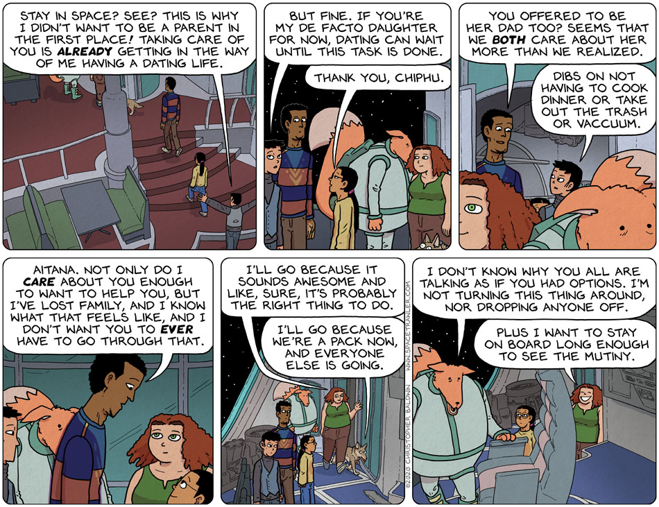In panel 4, Ciara appears to be looking at Tesfay with interest. Maybe I’m just reading too much into a small detail, but I can see why he’d seem like a good catch to her.