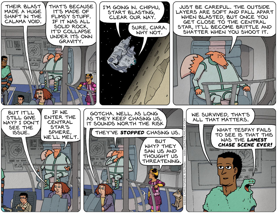 What she’s said so far suggests that any inhabitants live inside the shell, not on the burning surface facing the star. Which might say something about the habitability of said Void — like whether the shell is massive enough to keep an atmosphere or whether the star has pulled it all into itself.