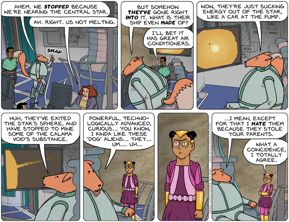 The fact that the Puppy-people refuel from a captive star AND mine its repellium shell indicate there’s more to them and their needs than have been identified. For some reason I don’t think either of these are going to remain unexplained.