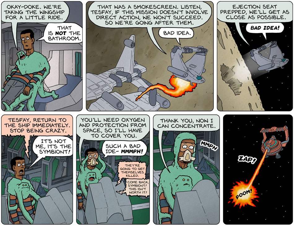 The symbiont manifested wings and escaped the waloofa beast in the sewers in front of Thuo’s. If it has now manifested a life-support getup for Tesfay, complete with hull-cutter to force entrance into the Puppy-people’s ship, I’m not going to be surprised in the LEAST.