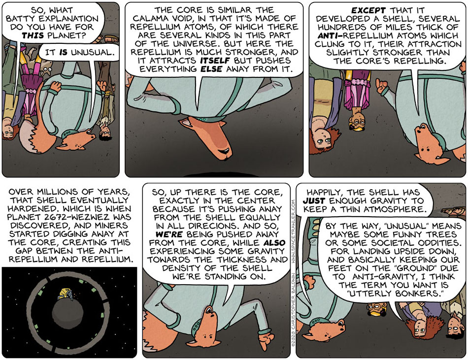 If you imagine that Chris’s strip is actually created by cameras that tag along with the characters, then this is simply a reference issue, like when you see footage of astronauts where the camera has them “upside down.” But, fortunately, Chris’s imagination is a lot more fun than “reality.”