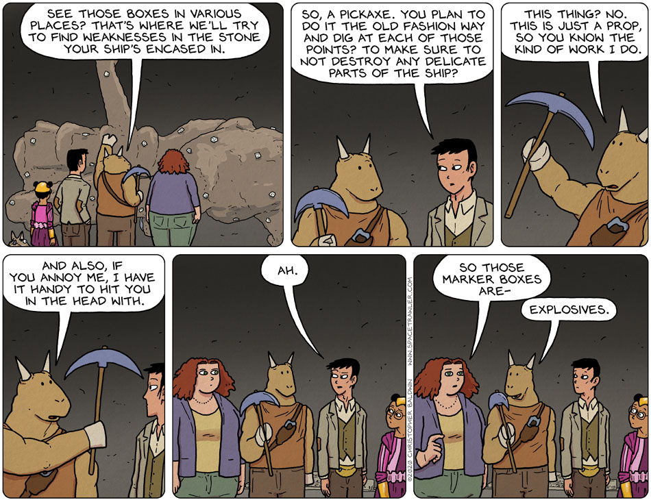 Of course, if they’re all set off at once, in an attempt to save time (and maybe skip the exploration part), things could get messy. But I thought these guys were already mining Gordian repellium and antirepellium, and so should know what amount of expensive explosives to use without wasting money.