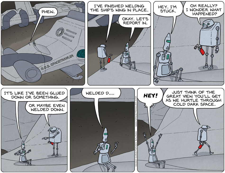 12/29/20 – Finished Welding Spacetrawler, audio version For the blind or visually impaired, December 29, 2020. https://www.baldwinpage.com/spacetrawler/wp-content/uploads/sites/15/2020/12/2020-12-29-audio-ST.mp3 Previous | Next 1st Series | 2nd Series | 3rd Series | First Strip Current Series | Archive | Most Recent Previous | Next 1st Series | 2nd Series | 3rd Series | First Strip Current Series | Archive | Most Recent The best seat in the house. First Strip First Series | First Strip Second Series | First Strip Current Series| Archive | Most Recent 12/28/20 – Wing Reattachment 12/30/20 – Ship Report 11 Comments Coyoty December 29, 2020 at 1:58 am 5 years ago “I won’t stand for this!” Rikard December 29, 2020 at 3:28 am 5 years ago Hehe, rebellion by following orders literally. Well done, therapy bot. Scorpinac December 29, 2020 at 5:15 am 5 years ago And that’s what you get for being a lazy asshat. tim December 29, 2020 at 10:26 am 5 years ago /I have worked in a steel fabrication plant and this comes closer to reality than one might think. Mgnostic December 29, 2020 at 10:43 am 5 years ago Given that he is sitting on the seam, we know where the tack welds are. TB December 29, 2020 at 3:38 pm 5 years ago At some point during a flight a crew member will pull up a shade on a viewport and be terrified to see a robot sitting on the wing. Coyoty December 30, 2020 at 4:46 am 5 years ago He’ll be played by William Shatner. Gregg Eshelman January 2, 2021 at 11:05 pm 5 years ago Or John Lithgow. Bonker of Things August 8, 2021 at 9:06 am 4 years ago Or by Carrey channeling Shatner https://youtu.be/KY-ru62rBC4 Meran December 29, 2020 at 7:56 pm 5 years ago I did not see that coming! Thanks for the surprise Chris!! 0z79 December 29, 2020 at 10:06 pm 5 years ago OK, so the GOB Spacetrawler just got a much better barbot. One of the legendarily good ones, that majored in counselling and ended up a bartender to make ends meet. Leave a Reply Cancel reply Your email address will not be published. Required fields are marked *CommentName* Email* Website Notify me of follow-up comments by email. Notify me of new posts by email.