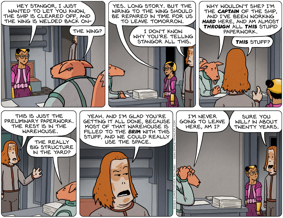 12/30/20 – Ship Report Spacetrawler, audio version For the blind or visually impaired, December 30, 2020. https://www.baldwinpage.com/spacetrawler/wp-content/uploads/sites/15/2020/12/2020-12-30-audio-ST.mp3 Previous | Next 1st Series | 2nd Series | 3rd Series | First Strip Current Series | Archive | Most Recent Previous | Next 1st Series | 2nd Series | 3rd Series | First Strip Current Series | Archive | Most Recent Twenty years isn’t so bad, right? First Strip First Series | First Strip Second Series | First Strip Current Series| Archive | Most Recent 12/29/20 – Finished Welding 12/31/20 – Guided Tour 9 Comments Nova December 30, 2020 at 1:52 am 5 years ago I mean, burning the warehouse down would free up that space too… I think there is a coyote nearby who has experience burning down buildings Coyoty December 30, 2020 at 4:44 am 5 years ago “Ruddock, I have a job for you…” “Hey, what happened to all the paper in the warehouse? It’s all chewed up and destroyed!” “The dog ate my homework. Can we go now?” FlySwatter December 30, 2020 at 7:38 am 5 years ago Yeah, somethin tells me Stangor really is almost done with her paperwork. Rikard December 30, 2020 at 11:32 am 5 years ago Hm, this sound like the time for a strategic “Ooops, flammable means inflammable? Dagnabbit this translator-chip is acting up…” The Shadow December 30, 2020 at 12:38 pm 5 years ago It seems that the penalty for leaving the thieves’ guild is a fate worse than death. M.A. December 30, 2020 at 1:40 pm 5 years ago I retired from a job that felt exactly like that… Efogoto December 30, 2020 at 1:43 pm 5 years ago This is the fourth strip with Gulfex in it, and the very first Gulfex smile. All it took was Stangor realizing the depths of her misery. Night-Gaunt December 30, 2020 at 10:40 pm 5 years ago Time to streamline the paperwork. Watcher January 1, 2021 at 1:16 pm 5 years ago Sounds like the mine is trying to delay the group. Leave a Reply Cancel reply Your email address will not be published. Required fields are marked *CommentName* Email* Website Notify me of follow-up comments by email. Notify me of new posts by email.