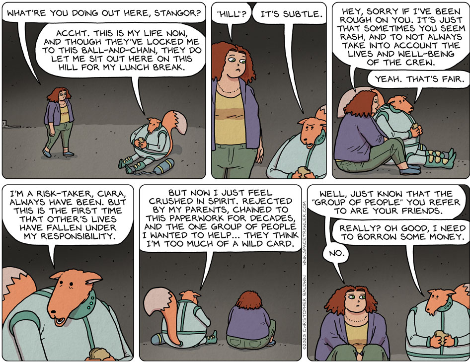 There are indeed subtleties in the inflections of Stangor’s voice. Notice that what Christopher has portrayed as a sandwich is actually a roulneeth. The actual overtones and undertones present in the Stangor’s dialog indicate that she is despondent over not having a steaming mug of roulneethdunk to properly soak the roulneeth which she has listlessly taken a rather dry bite thereof.