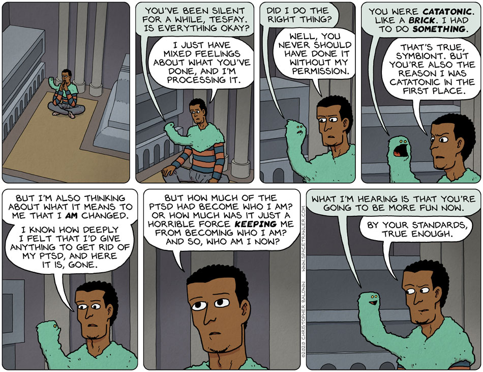 I would love the opportunity to ponder that very same question…even if it meant I got stuck with symbiont for an extended period of time. And it didn’t criticize my choice of food stuffs. Moon Pie(banana) and RC Cola are important nutrients.