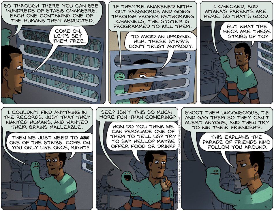 What’s the deal with lethal booby-traps everywhere? Can’t get Stangor free without killing her. Can’t release the human captives without killing them — that’s not just bloodthirsty but wasteful. Think of all the time the stribs would need to spend rounding up an equivalent batch. Not to mention the houses they’d crush, something they never cared about. One escape attempt is worth all that murder and loss? I think they need to talk to their insurance adjuster, get a less-lethal rider on there before they spend the rest of their days crushing houses on Earth.
