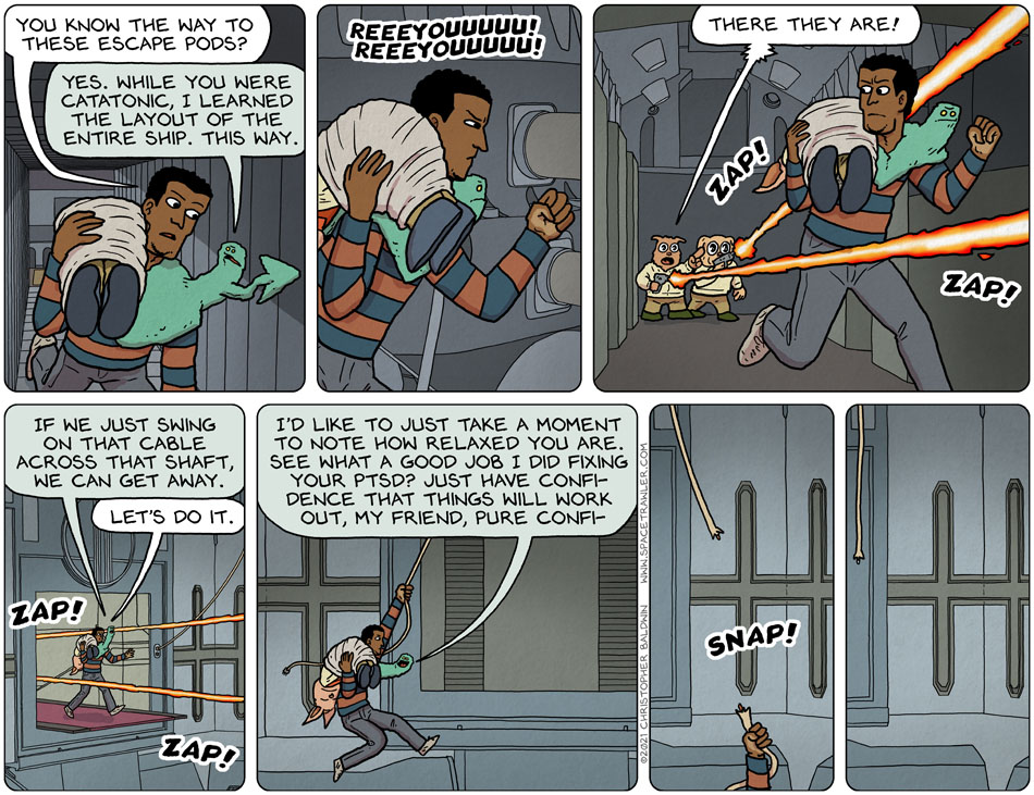 I’m not sure if my desire to put a huge shaft to swing across in all my sci-fi comics comes more from Star Wars, or the videogame Pitfall. But I do love it. 🙂