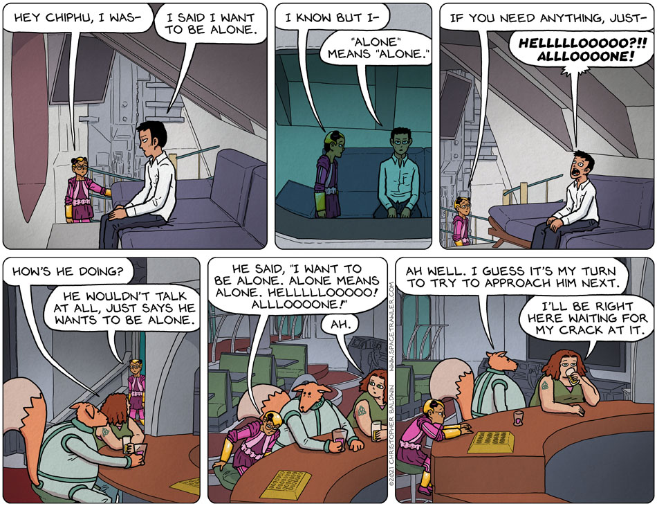 In the meantime, I’m just glad no one has pointed out that he’s now the only male in a ship otherwise crewed by females and bots. As difficult as that might be for some people to process, I get the impression Chiphu’s source of depression is deeper, and older, and tougher. He’s got a tough journey he has to make alone. I’d leave him to it until he finds what he’s looking for.