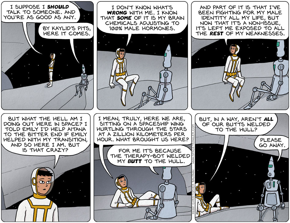 Some people have tried for years to attain that particular feeling. Not something Chiphu needed as he was finally transitioning to the body he feels he should have been born with. Now it seems like a distant, tiny thing as he sees just how big things are outside of Earth to the greater cosmos. Actually experiencing it is a blow to his views of reality. Not everyone can adjust to that.