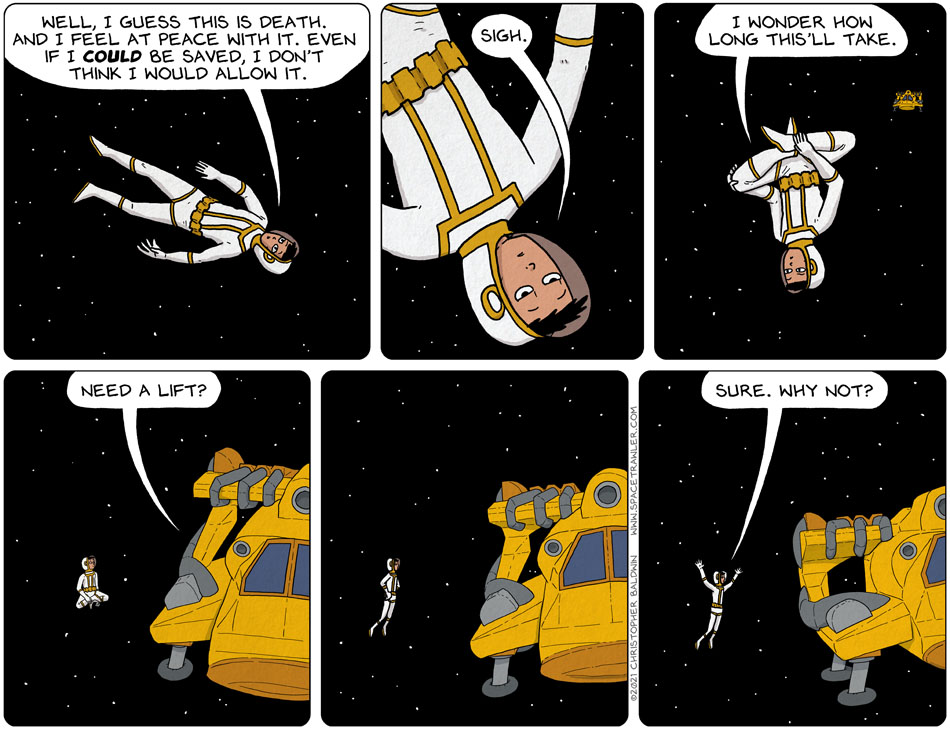 Life gets easier when you just go with what happens, especially if you don’t have a good reason to refuse. Chiphu seems to be living at the bare edge of existence, and I don’t mean running out of air in deep space. He’s had a lifelong need addressed, and found it complicated his life, but instead of getting bound up in it, he feels free to discard all that rather than let it bother him.