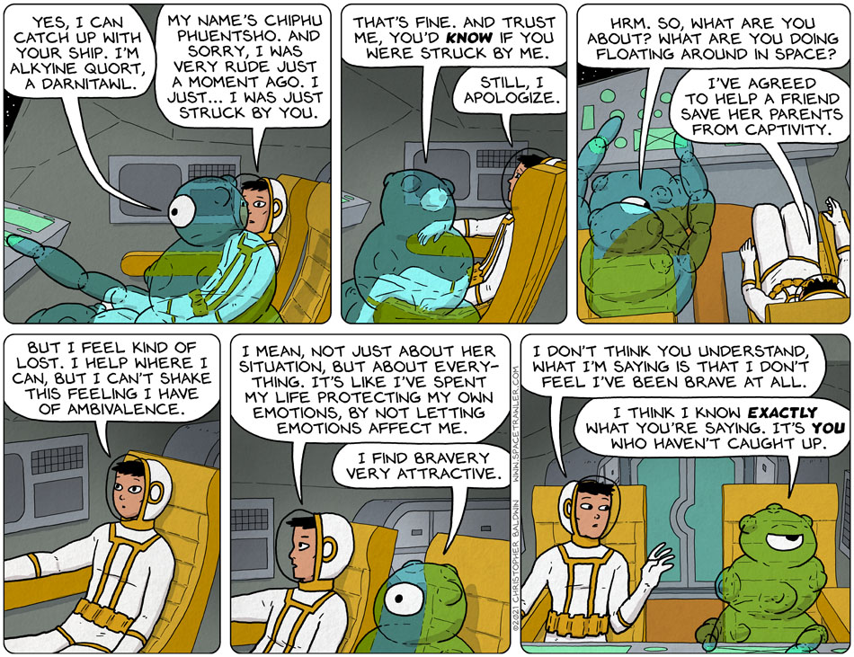 I’m charmed by the visual and linguistic puns, Chris. Wonderfully distracting from Alkyine and whatever he/she/it/them are doing on their lonesome so far out in deep space and yet with time to pick up a lost and awkward human. I sense great things about to grow from this. No, not that way! Well, on second thought, I don’t really know.