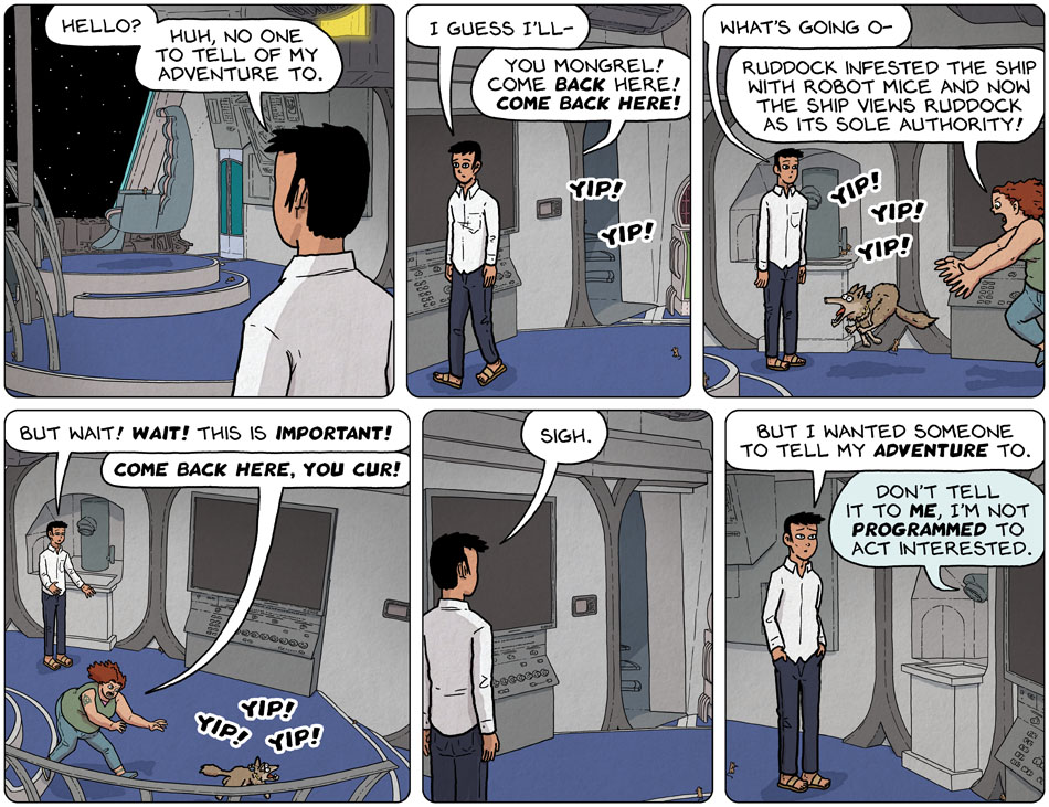 It ain’t just the food synth that isn’t programmed to act interested. This is Nogg’s ship. Association with him has trained all of the AIs to treat fleshy beings with contempt. Possibly patterned on Krep’s example.