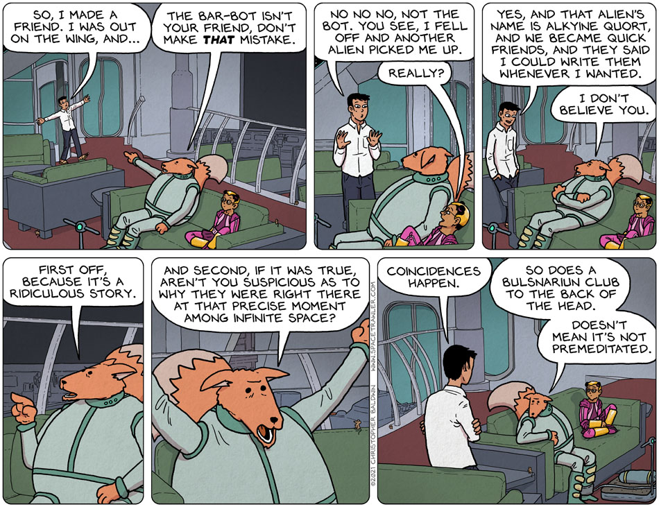 I’m just really happy and appreciative you’re keeping the Spacetrawler schedule up. The only other webcomic that consistently maintains their schedule is Gunnerkrigg Court and they don’t have nearly the detail you put in yours! Thank you, Christopher.