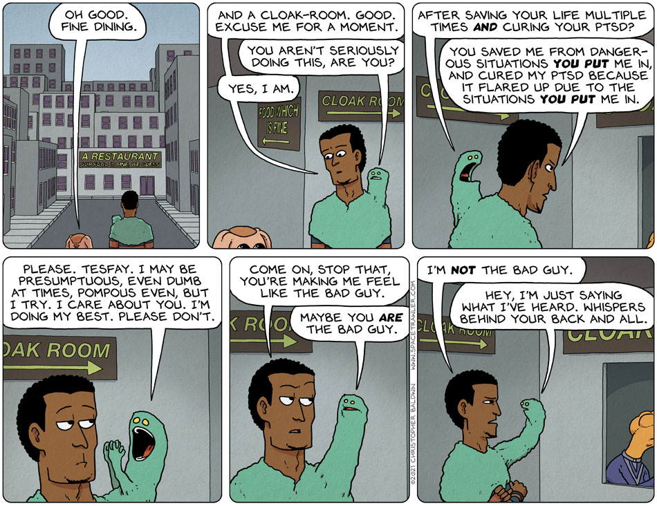 Generating his own black backstory. I always despised the symbiote for what it represented (i.e., the virtues of parasitism) but now he’s gone too far. Spinoza says that it is worse to think your friend could do you evil than any evil they do you, but the symbiote lives by that maxim made to work for itself. For less than this I would feed him into a reactor chamber and use him for propellant.