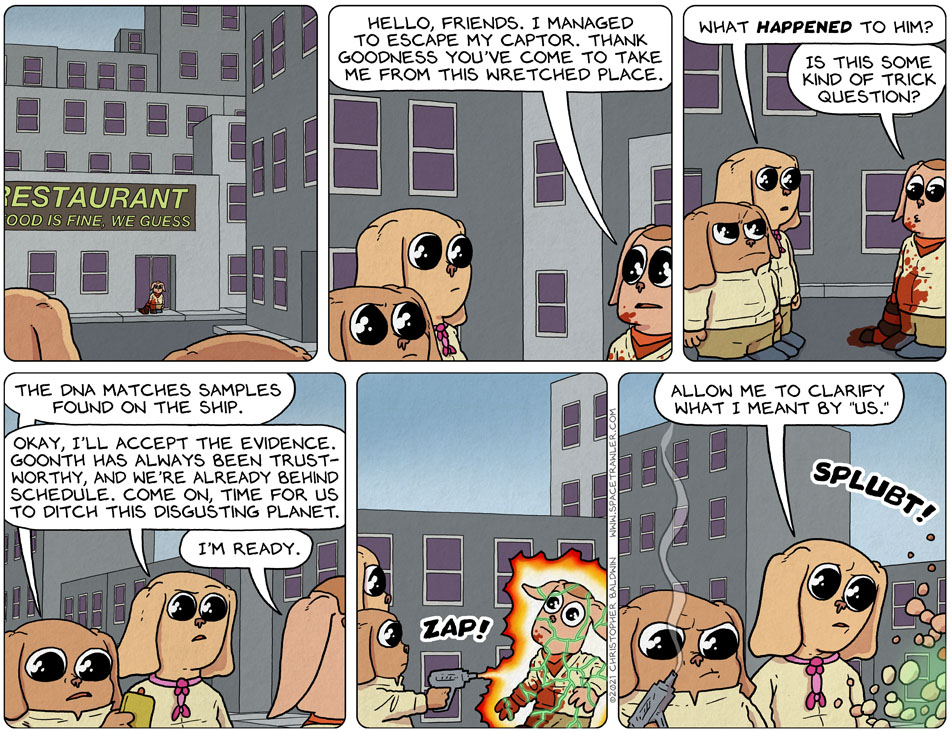 Regarding the Symbiont, I quote from one of the volumes featuring Buck Godot, Zapgun for Hire: “I’m convinced that he’s got someone out there paying him to breathe!”