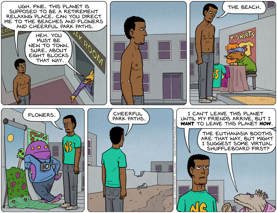 Ethical suicide parlors across from resurrection booths. Kurt Vonnegut, meet Roger Zelazny.