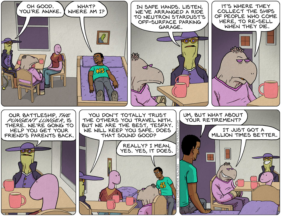 Looking forward to finding out if this crew is as good as they say. Tesfay has been a magnet for interesting experiences. Well, mainly trouble. Even on Earth. Poor guy. Did someone in his youth curse him with the faux-Chinese blessing/curse ‘May you live in interesting times’? He certainly has!