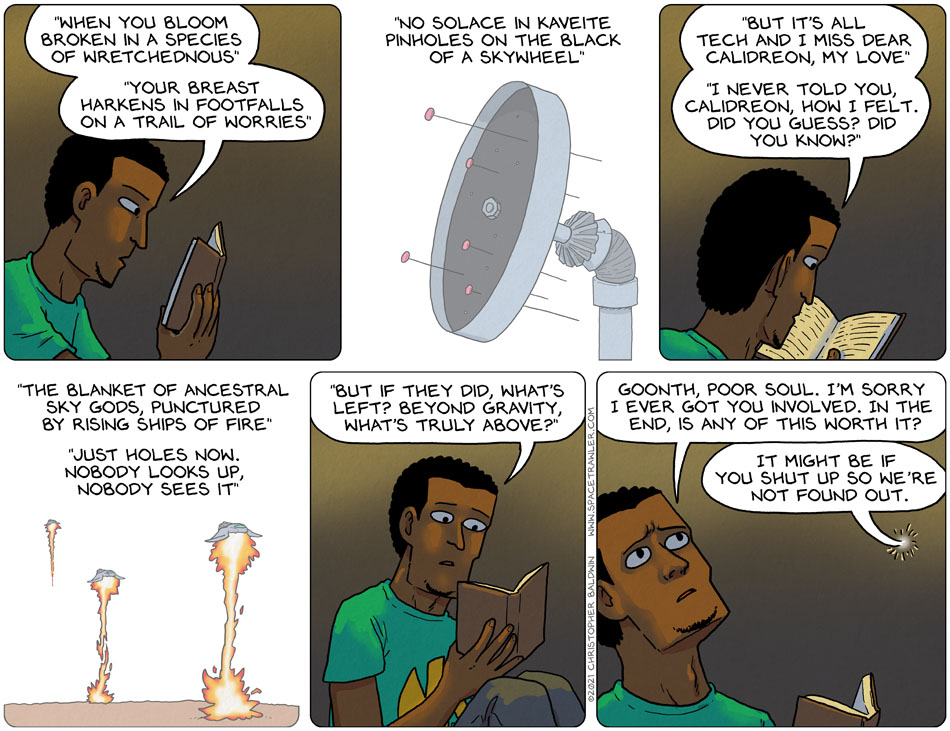 Boy oh boy, I can’t wait to hear how Goonth pulled THIS escape off! Did not see that coming. And I can’t help but wonder if it’s truly a coincidence they’re on one of the few ships left that can actually take off from Neutron Stardust, policy or no.