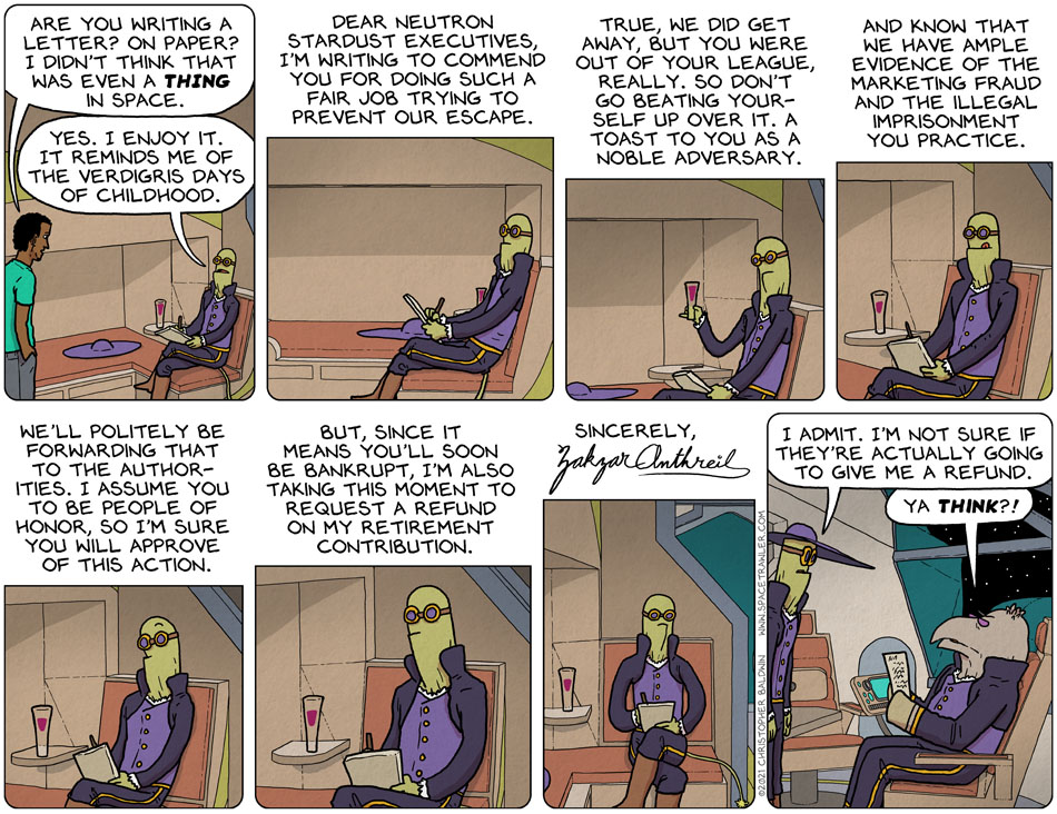 I like how Zakzar refers to her “verdigris days of childhood” in panel 1 (much like Cleopatra’s line “My salad days, When I was green in judgment” (in Shakespeare’s Antony and Cleopatra)), but shows that she’s not so far from them as she thinks when in panel 6 she holds out hope of a refund.
