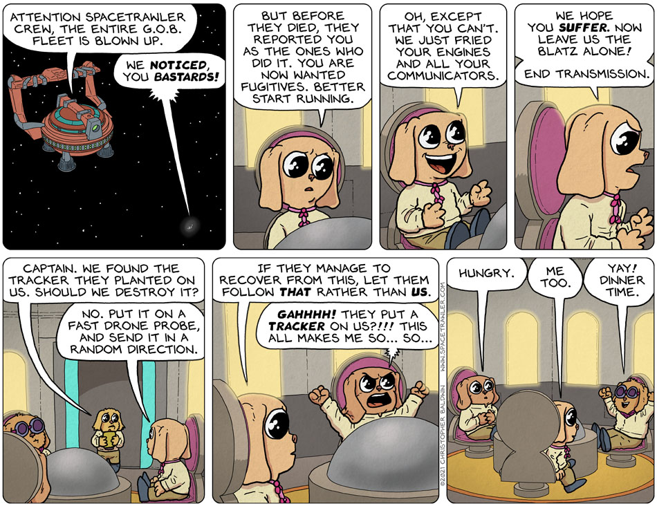 Obviously the Stribs expect the revenge GOB fleet to be just as bloodthirsty as they are, destroying Spacetrawler on first detection. It’s a primal mistake to think the enemy is as stupid as you are. But it does raise the question of what to do until they show up. If the communications can be fixed, that would be helpful. But whether they can be fixed depends on what was fried and what spare parts are available. The Stribs tend to think in terms of one strike and you’re out, so I don’t know that they blitzed the spares when they fried comm and the engines. Come to think of it, what DID they do to the engines? The fact that the controls were unresponsive as they talked may mean it’s the controls that were fried, not the darkspeed drive itself.