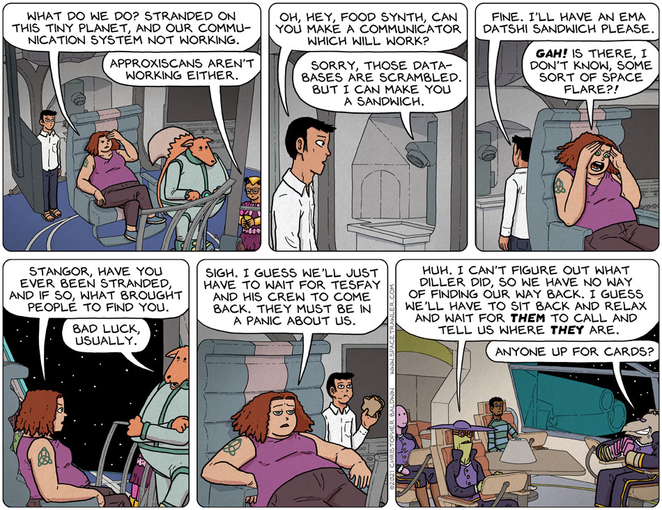 Looks like we’re going to have to wait until a) Stangor’s ‘luck’ operates, b) Ciara gets bored enough to ask the ship and its bots about the problems and what it will take to repair them, c) Zakzar decides to find a nearby planet and figure out where they are, d) the GOB revenge fleet shows up and does God knows what, or e) Something else unpredictable and nonlinear occurs and throws the works into a cocked hat.
