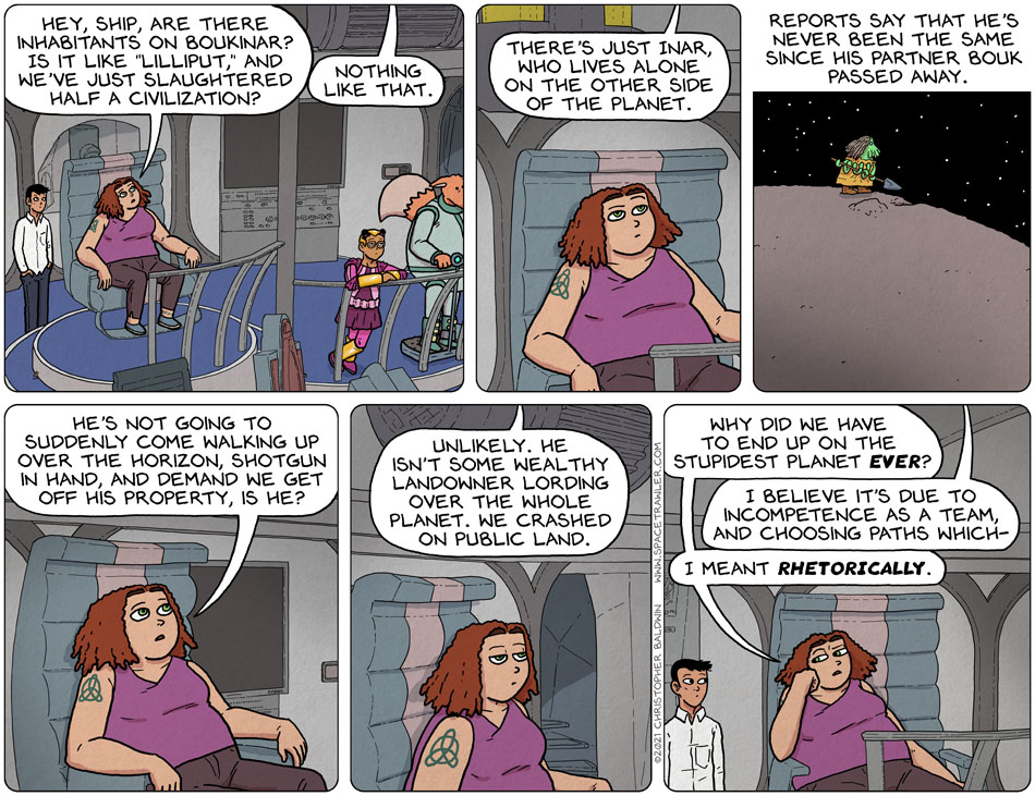 I wonder if Inar felt Spacetrawler crash. I mean it’s not likely he/she/it/them could have missed it. Will curiosity impel a meeting? Will mystic knowledge trade hands? You know, like: Unscramble the ship’s databases for a really mean margarita recipe?