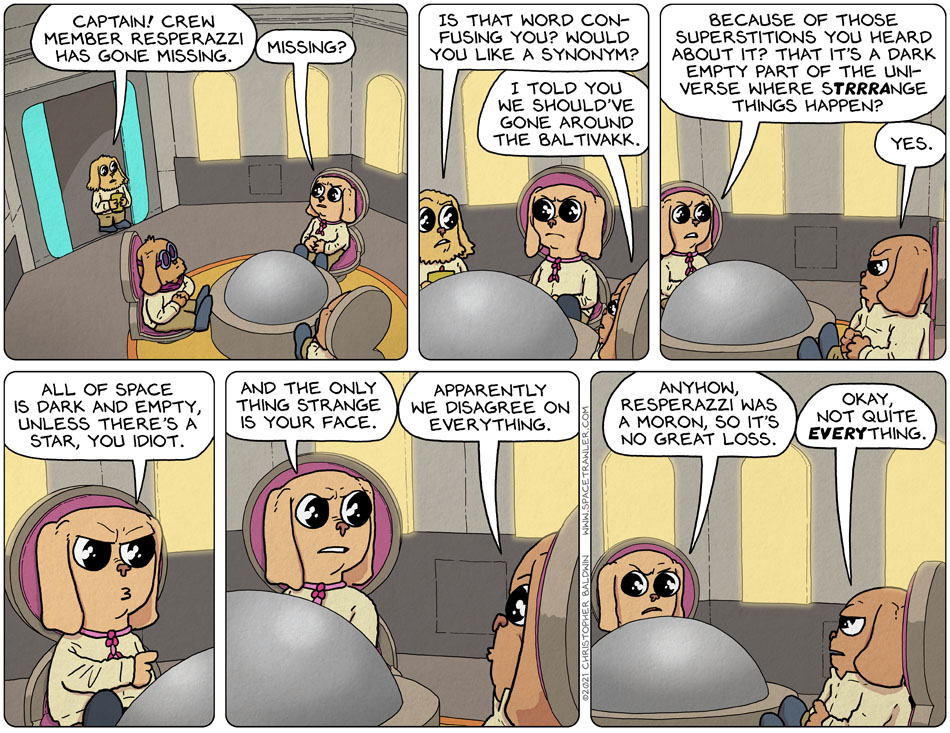 That being said… I’ve been contemplating Ruddock’s known motivations for the reason he went aboard the Strib ship instead of getting rescued. A) Find food. Not really a choice here, unless the Stribs have different kinds of food synthesis that might be superior. B) Join a pack and increase their genetic diversity. Ruddock’s not bothered to even ask his approxiscan collar what the likelihood for viable offspring would be between coyotes and Stribs, so this seems equally unlikely.