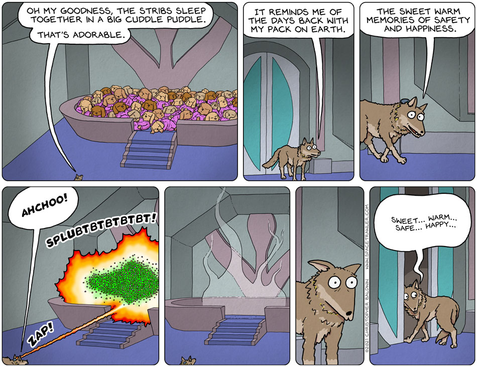 What I can’t get over is how the Stribs are like little match heads. Normally, the laser blast would splupt only one Strib, and maybe the Strib behind that one. But no! Splupt one and the whole bunch is splupt.