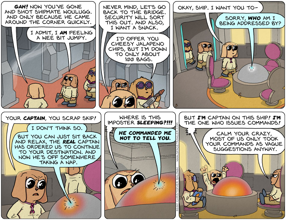 Ah, reminders of Holly from the Red Dwarf series. I loved that show and I’m always happy to root for cheeky mind-of-their-own ship controls. “Don’t you dare tell them, Ship, where your proper captain’s napping. And how bout bringing out some mice to entertain the new underlings?”
