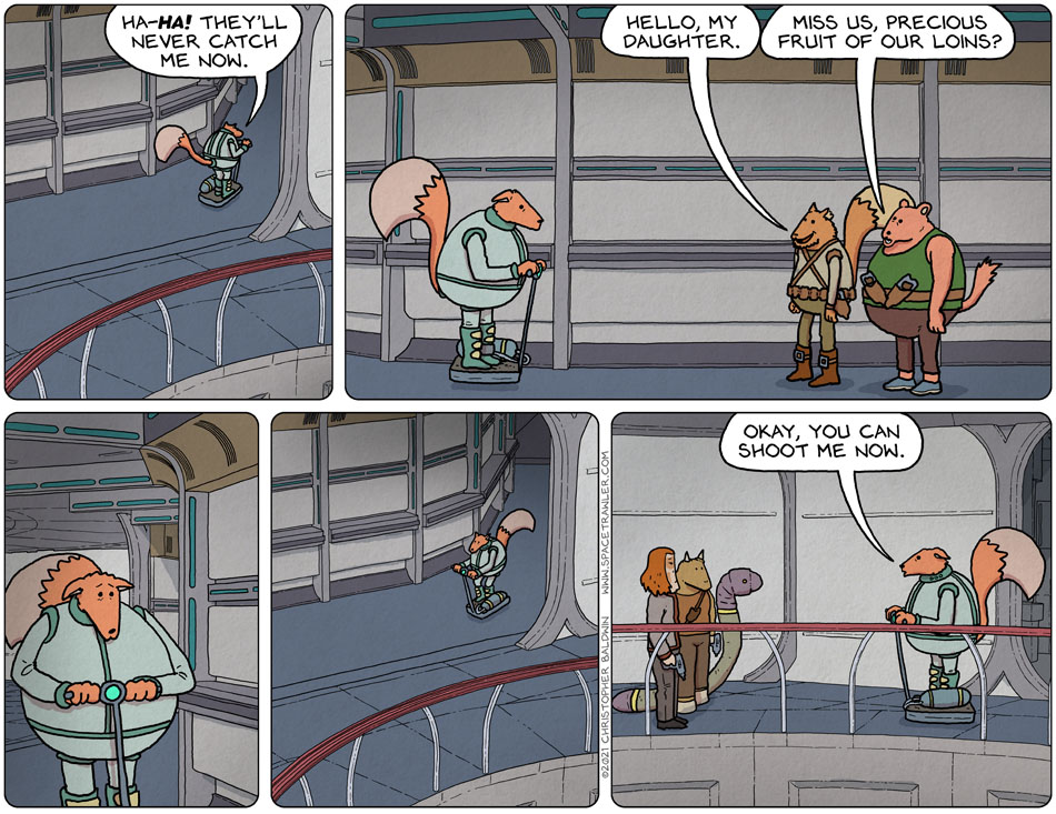 Wait. Where’d Stangor’s ‘rents come from? The gangster ship? Their own? If so, how’d they find it the same time the guncreatures did? What gives with their change of heart? I smell opportunism, not to mention greed.