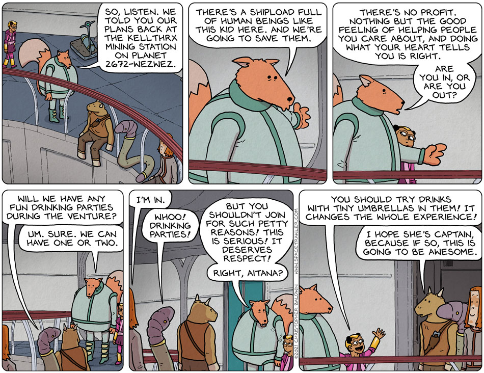 10/15/21 – In or Out Spacetrawler, audio version For the blind or visually impaired, October 15, 2021. https://www.baldwinpage.com/spacetrawler/wp-content/uploads/sites/15/2021/10/2021-10-15-audio-ST.m4a.mp3 Previous | Next 1st Series | 2nd Series | 3rd Series | First Strip Current Series | Archive | Most Recent Previous | Next 1st Series | 2nd Series | 3rd Series | First Strip Current Series | Archive | Most Recent Drink umbrellas make all drinks better. First Strip First Series | First Strip Second Series | First Strip Current Series| Archive | Most Recent 10/13/21 – Fessing Up 10/18/21 – Mutual Feelings 8 Comments Coyoty October 15, 2021 at 1:59 am 4 years ago Some of the others may say she’s not the captain, but she’s really the captain. They all obey her and she wins every fight. Pibbles October 15, 2021 at 3:09 am 4 years ago She is Ship Mascot. Sort of like Captain, but less responsibility. M.A. October 15, 2021 at 2:53 pm 4 years ago And lots less blame when stuff goes sideways… Robert December 3, 2025 at 5:07 pm 2 weeks ago This is Ruddock erasure Kaidah October 15, 2021 at 8:30 am 4 years ago Dammit Kif! Where’s the little umbrella? That’s what makes it a scotch on the rocks. Pete Rogan October 15, 2021 at 8:32 pm 4 years ago Robert S. Thompson, the man who saved Avis Rent-A-Car, said that there are only two reasons for going into business: To make money, or to have fun. I’ve always felt there’s no effective difference between the two. Why can’t you make money and have fun at the same time? L’aissez les bons temps roulez! >singing< Things go better with booze! TheWreck October 17, 2021 at 5:11 pm 4 years ago I think Aitana understands that you have to shape the recruitment pitch to the audience you’re pitching to. Col October 17, 2021 at 6:51 pm 4 years ago I love how a 10 year old is now regulating the Alcohol supply! Leave a Reply Cancel reply Your email address will not be published. Required fields are marked *CommentName* Email* Website Notify me of follow-up comments by email. Notify me of new posts by email.