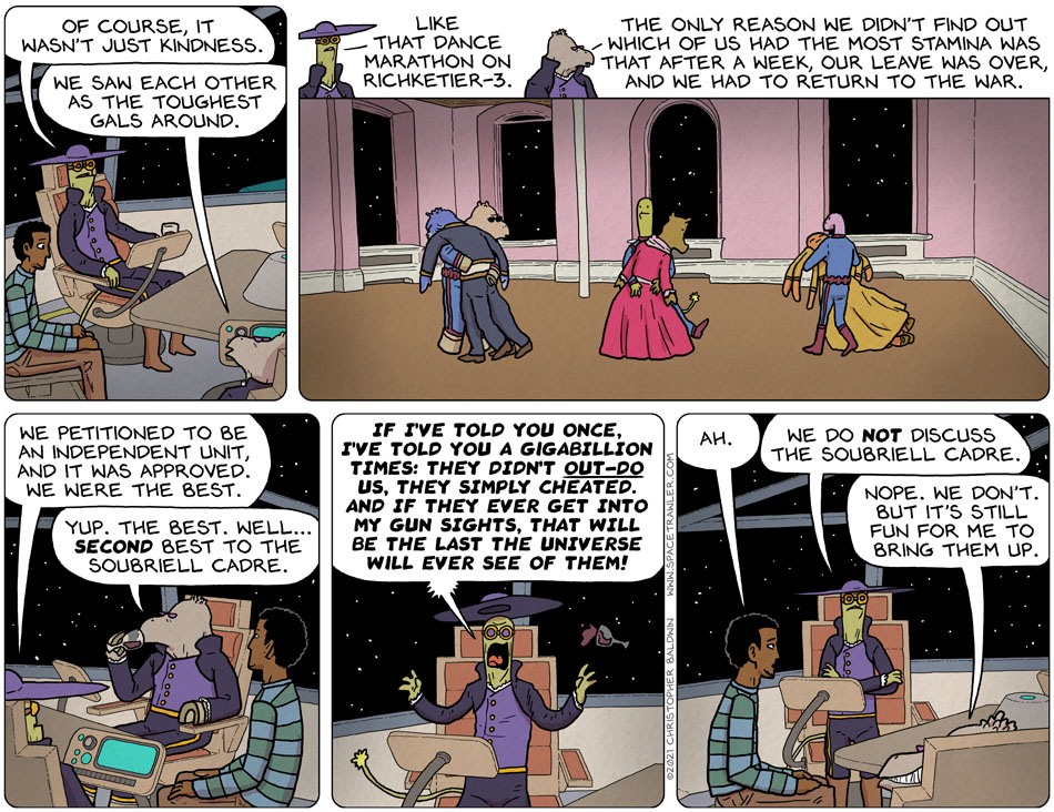 Oho! And now the question becomes: What’s the story behind the Soubrielle Cadre? How did THEY meet? When and how did THEY cheat at war? And what did they do when they were caught at it? Sounds like a story that will come out later in the telling, to mingled disgust and awe. Or just awww; sometimes it’s hard to tell the difference.