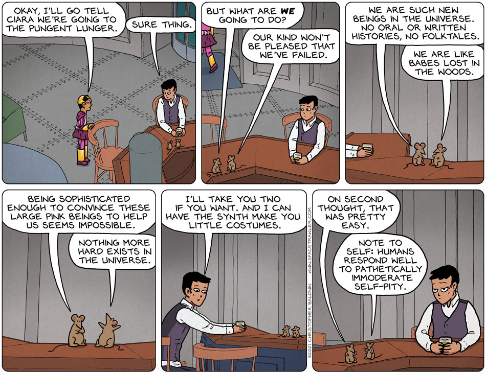 And the robo-mice have made the same discovery about humans that the Strib have: That being pathetic and seemingly helpless and at the mercy of humans causes them to throw caution aside and try to help. A little more technology, and they too might be moving a human population to a new world to make a better society for themselves. However they imagine that to be, or will imagine.