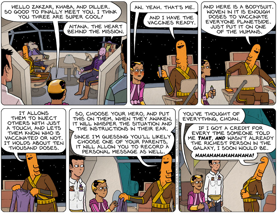 12/24/21 – The Heart Behind The Mission Spacetrawler, audio version For the blind or visually impaired, December 24, 2021. https://www.baldwinpage.com/spacetrawler/wp-content/uploads/sites/15/2021/12/2021-12-24-audio-ST.m4a.mp3 Previous | Next 1st Series | 2nd Series | 3rd Series | First Strip Current Series | Archive | Most Recent Previous | Next 1st Series | 2nd Series | 3rd Series | First Strip Current Series | Archive | Most Recent Choan. The person who scares you and who you also REALLY want on your team. First Strip First Series | First Strip Second Series | First Strip Current Series| Archive | Most Recent 12/22/21 – Welcome Aboard 12/27/21 – Delicate Knowledge 8 Comments Efogoto December 24, 2021 at 12:54 am 4 years ago I know Leb and Pally are moving on to the Strib ship, but for this moment Mus Ruddockulus has spread to a third ship, setting foot where even their creator has not been. I am so proud of their achievement. Efogoto December 24, 2021 at 12:55 am 4 years ago Also: 0-0-0-0-2-2 Coyoty December 24, 2021 at 4:05 am 4 years ago She’s Batman. Frankie D. December 24, 2021 at 4:14 am 4 years ago So, a jesus suit? Efogoto December 24, 2021 at 1:34 pm 4 years ago Wouldn’t that distribute loaves and fishes? Matthias U December 24, 2021 at 6:50 am 4 years ago and *lets* them know Christopher Baldwin December 27, 2021 at 1:14 am 4 years ago Thanks, @Matthias U! Fixed! Pete Rogan December 24, 2021 at 9:24 pm 4 years ago You really don’t have a choice as to which team she’s on. Either she’s on YOUR side, or you’re part of the soon-to-be-ungrateful dead. Not even a middle ground unless you’re a barbot. Whose service in utility is dependent upon her needs at the moment, so: Beware. Leave a Reply Cancel reply Your email address will not be published. Required fields are marked *CommentName* Email* Website Notify me of follow-up comments by email. Notify me of new posts by email.