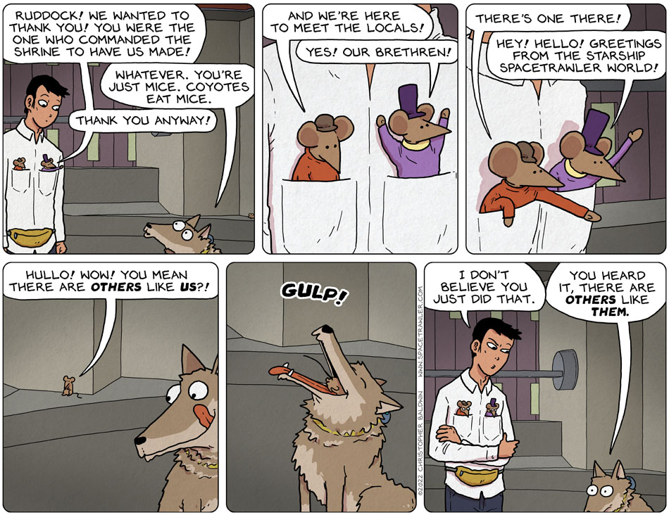 This could complicate what will need to be done with the Stribs, if and when they’re cornered and collared. If Ruddock finds them toothsome, which is to say, edible, is this enough to establish an off-world coyote colony or three to handle their disposal? They’re by no means as hapless as the Furryites, got to say.