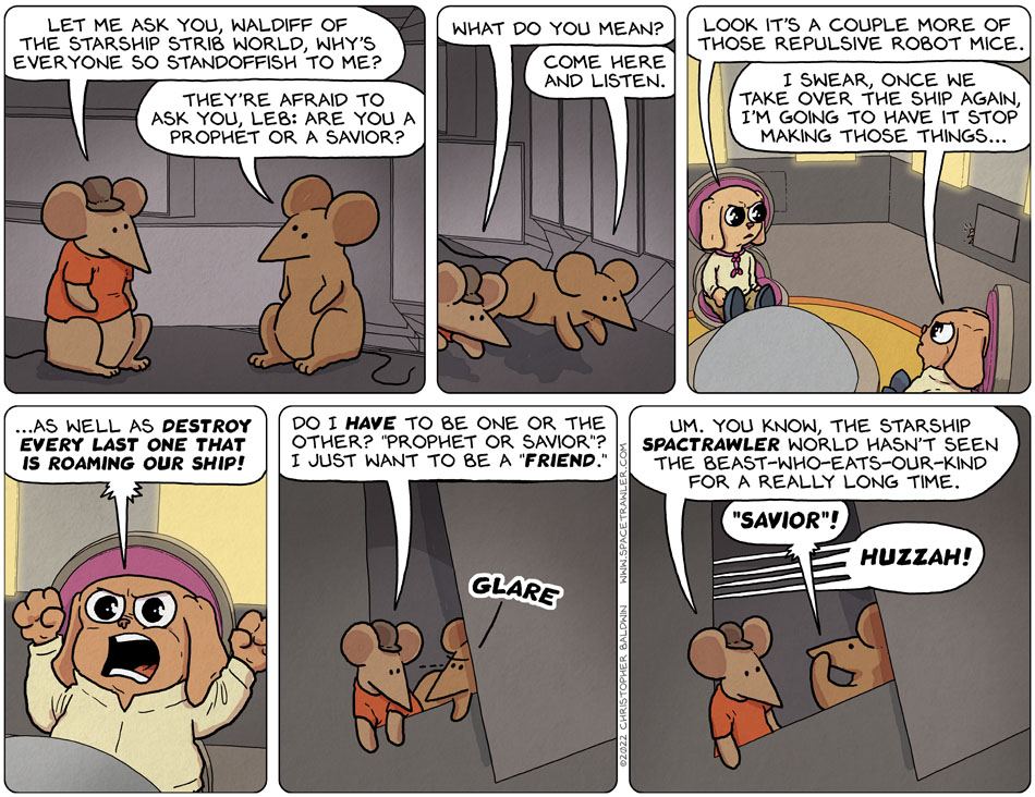 Leb now has no choice but to don the mantle of ‘Savior’ and deliver the Strib-ship robot mice from their fate. This is an apocalyptic role, with no escape: He (pronoun of convenience, since all robot mice were apparently created genderless) must either succeed or perish with everyone else. That sets up a really interesting zero-sum game: Either Leb frees the Strib-ship mice from Ruddock or he goes down Ruddock’s gullet. There may be a way to preserve both of them, but not in the same space. I don’t know if Leb is capable of thinking that large, or that far ahead. But if he’s lucky, the Strib-ship mice will have lots of ideas he can use to check out what’s possible.