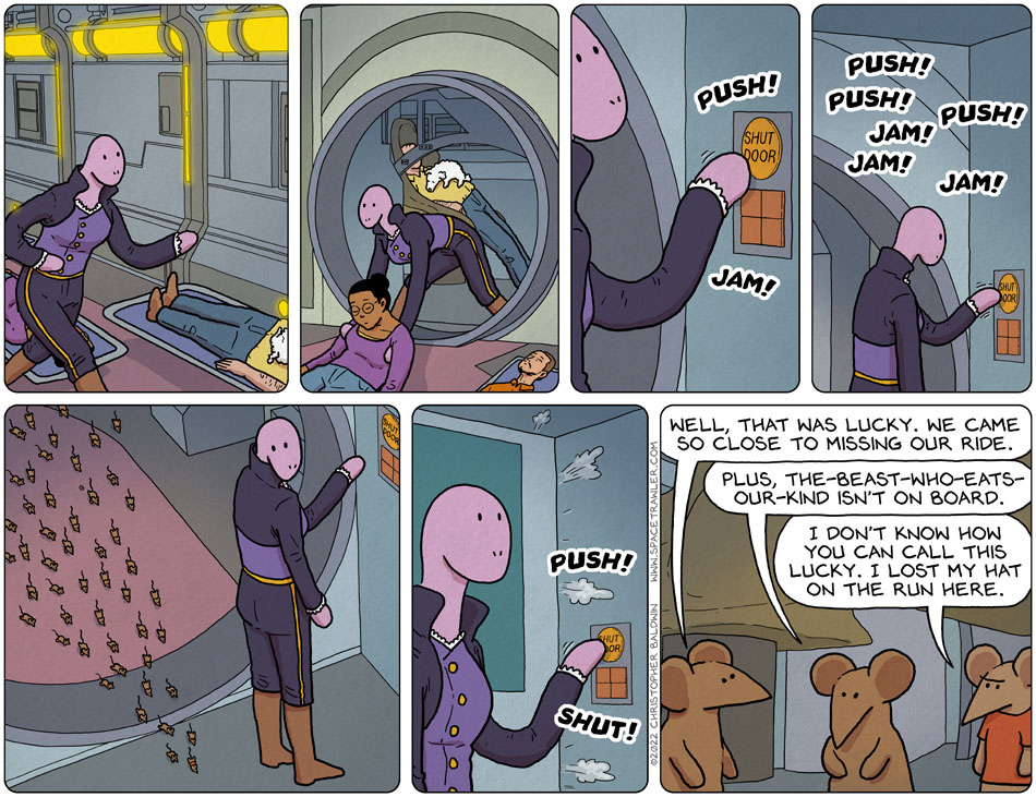 That said… tlhonmey is correct about verisimilitude in character actions and consequences. But I think we’ve been shown enough to know there’s a whole lot we don’t know about the Stribs, their command structure, and other factors impinging on their ability to make reasonable, clear decisions. Like what their actual plans are for settling Planet Lovingkindness. And I will repeat what I said about readers investing in the characters doing the same thing with the villains. They EXPECT some hurtful harm from them, unexpected abilities or aims that make hash of the plans of the heroes, who then must adapt, probably imperfectly. But that’s what they EXPECT. Your audience will be gripping their chair arms to find not one, but SEVERAL obstacles the Stribs have put in front of them, some obvious, others not, but all potentially lethal.