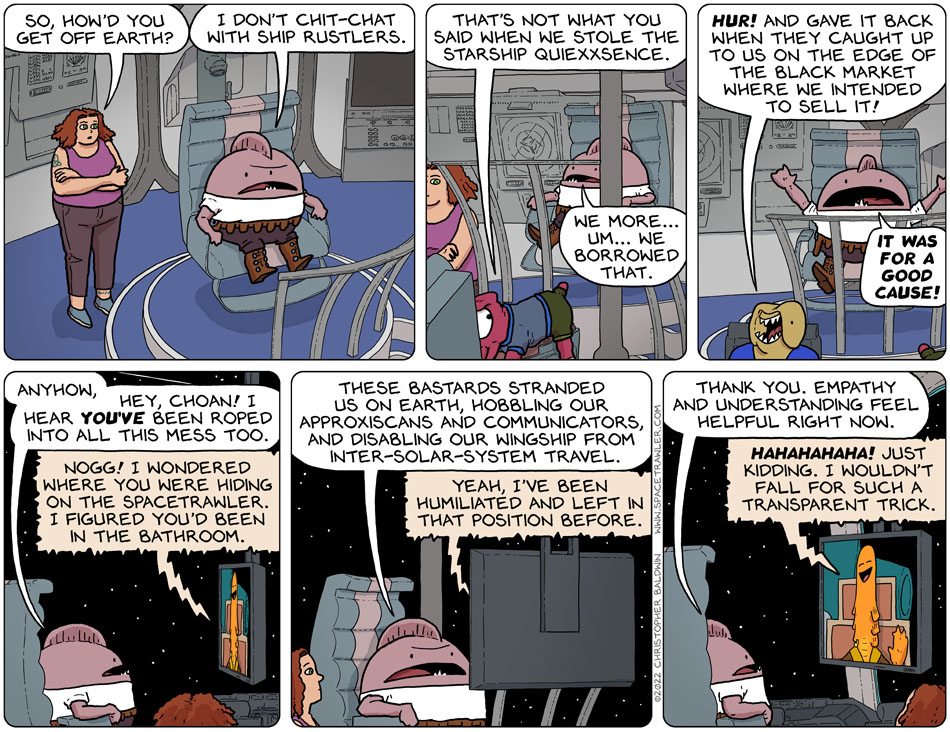 Hey. Wait. How long did Nogg, Gurf and Krep stay on Earth incommunicado? How’d they get off the planet? Somebody help them, did they call for help, friendly pirates, what?
