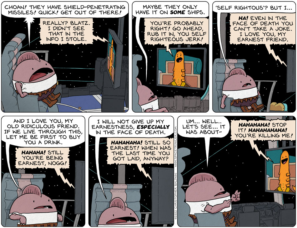 Looking forward to the next dead-serious thing Choan gets Nogg to say or actually do. He’s a practical-jokester’s best friend. Right up to the cream-pie mountain detonation. SSPPLLUUUUURRRRRRTTTTTTTT! Ah, ha ha ha ha ha ha ha!