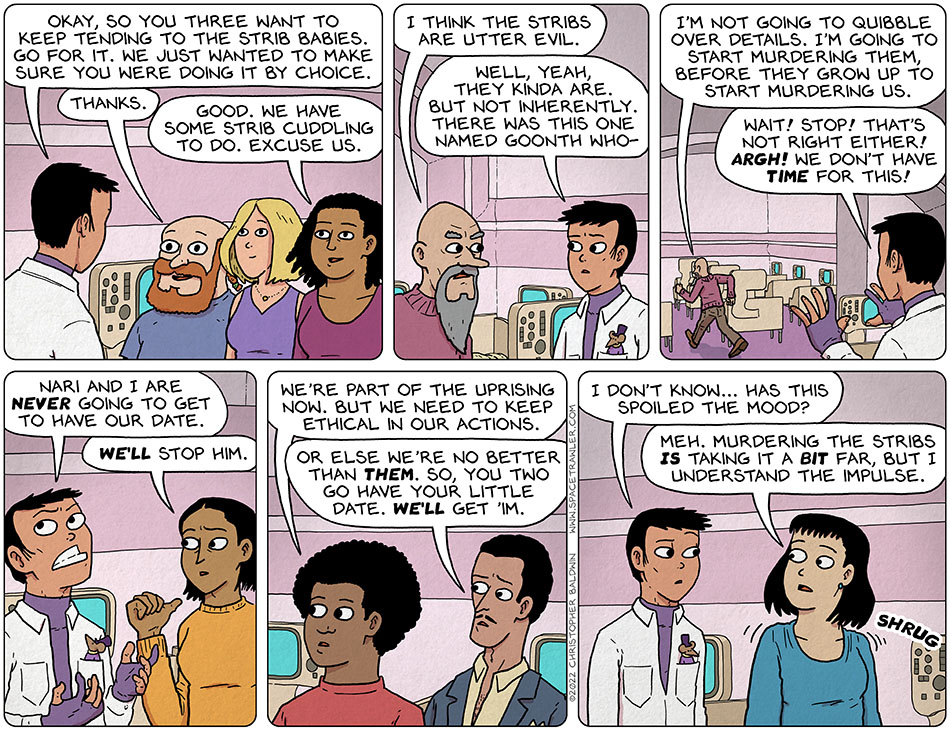 I think the Stribs aren’t evil, just brain-damaged. Their brains probably have immature prefrontal cortexes, or the equivalent. They look like puppies, indicating they developed neoteny in their race, along with immaturity, possibly as an effect of trying to stop aging.