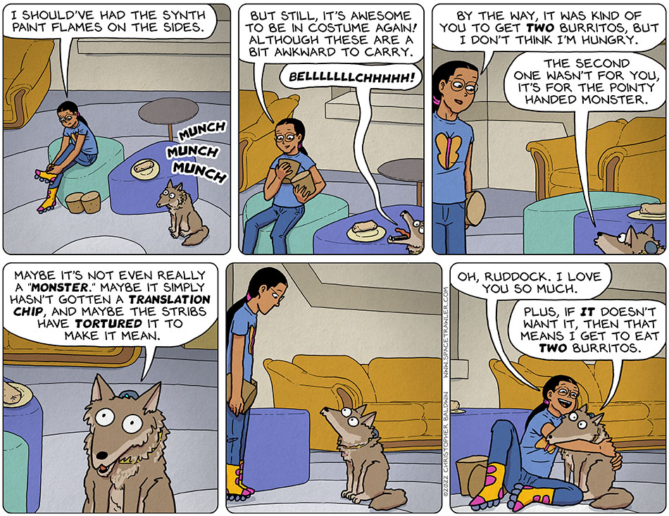 We know Ruddock’s weapon is set off when he sneezes. It’s a good thing his BURPS don’t set it off too or no one would be safe. I chuckled over how Ruddock looked in the last panel being hugged. Almost looks like Aitana’s hug is choking him with his crossed eyes.