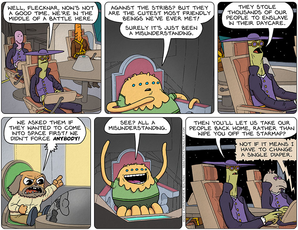 So now the Stribs are running into technical issues they can’t fix easily, like the unexplained disappearances of crew members and the sudden increase in organically-based dust clogging the air filters. I’m sure the Fletharians, out of the kindness of their hearts (or heart-analogs), will be more than happy to sign the Stribs to a long-term maintenance contract, specifying all the items needed to maintain/repair the ships are to be sourced ONLY from Fletheria. Oh, and all the maintenance MUST be done ONLY by properly-certified Fletherian technicians. And did I mention the costs of patent violations if the Stribs try to build their own versions of these ships? I assure you, the Stribs will be bound to the Fletharians for the life of the Strib species.