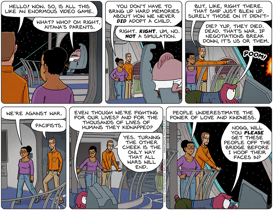 @Silence, well said. And yeah, I wanted to throw this perspective/reminder in, of wanting peace and there being killing going on, but of course Spacetrawler is a comedy, so I pushed it to the level of a bit of silliness (read:suicidal). 🙂