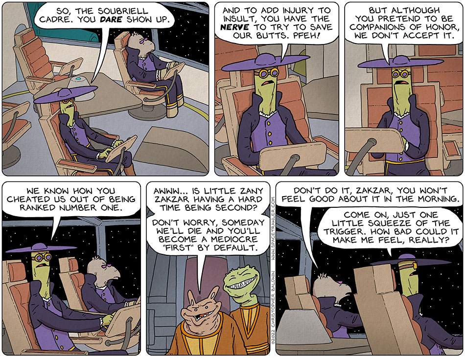 In the audio for the previous strip, it’s stated that Choan is no longer on the bridge because she is working on the engine. Of course, this shouldn’t deter us from wild speculation.