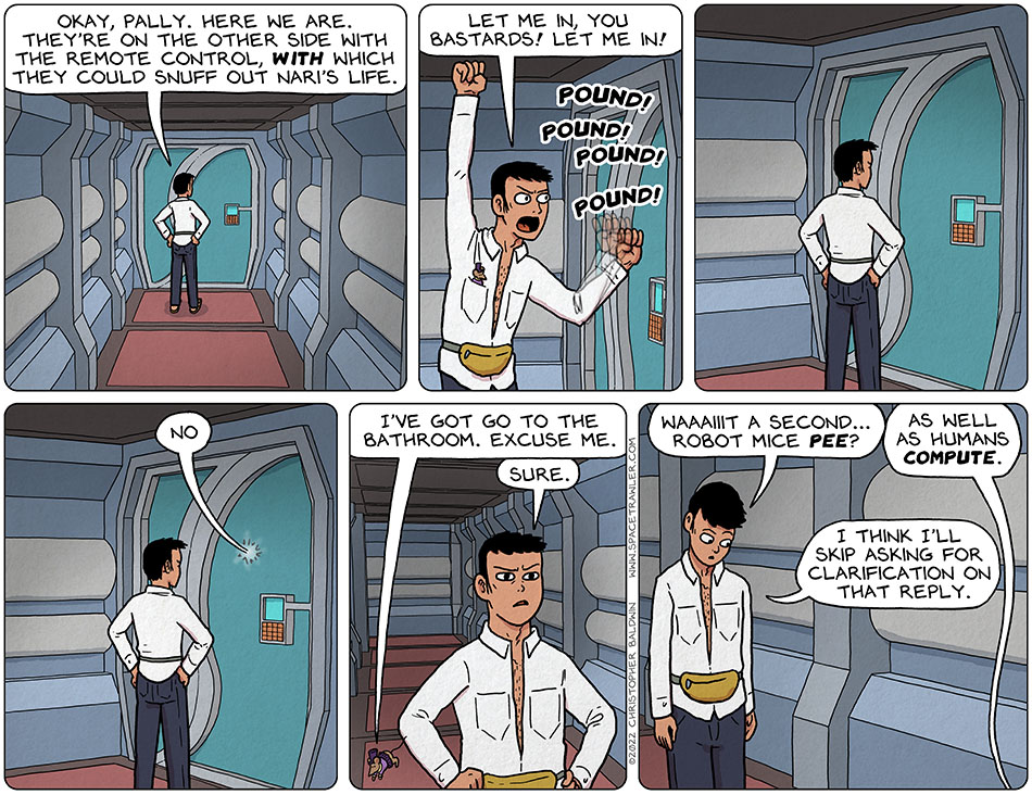 But I AM wondering how ‘robotic’ these mice really are. They’re more than food, and plainly more than mechanisms. And they have shown they have a religious sense. Like it or not, they’re close to the standard for GOB sentient-race admission. Give them interstellar capability and pow, they’re in. Ahead of humanity. Doesn’t that just scroll your nurd?