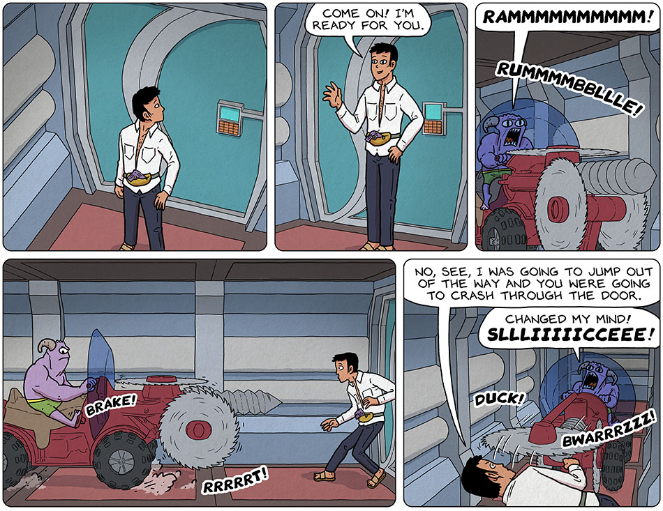 I feel like we need an extra panel between 3 and 4 showing him stopping before he reversed in panel 4. Took me a bit to work out what happened.